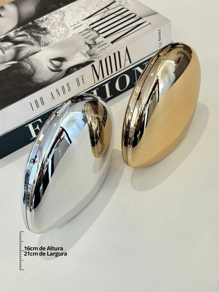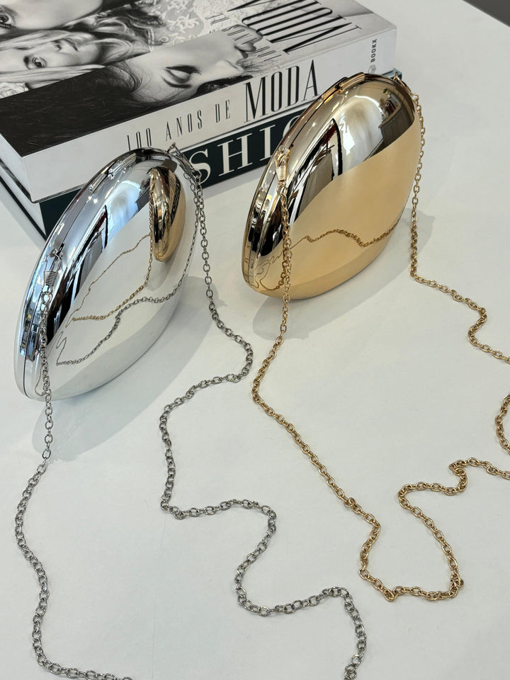 ESTA CLUTCH É UM VERDADEIRO SÍMBOLO DE ELEGÂNCIA E MODERNIDADE. COM UM DESIGN MINIMALISTA E ACABAMENTO EM METAL POLIDO, ESTÁ DISPONÍVEL NAS OPÇÕES DOURADA E PRATEADA, AMBAS COM BRILHO ESPELHADO QUE REFLETE SOFISTICAÇÃO. O FORMATO ORGÂNICO E COMPACTO É COMPLEMENTADO POR UMA ALÇA DE CORRENTE DELICADA, QUE ADICIONA UM TOQUE CLÁSSICO AO VISUAL CONTEMPORÂNEO. IDEAL PARA EVENTOS FORMAIS OU PARA ELEVAR UM LOOK NOTURNO, ESTA PEÇA É UM ACESSÓRIO INDISPENSÁVEL PARA QUEM BUSCA UNIR ESTILO E FUNCIONALIDADE.